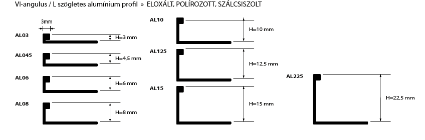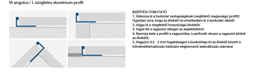 Az L alakú szögletes profil a különféle anyagú burkolatok külső sarkainak egyenes lezárására szolgál. Védi az éleket a csorbulástól, külső mechanikai behatásoktól. Célszerű olyan esetben is használni, ahol a sarkok és szélek eldolgozásához nincs elég hely.