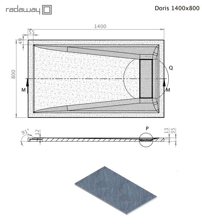 Szögletes, aszimmetrikus, műmárvány zuhanytálca, közvetlenül a padlósíkra építhető.